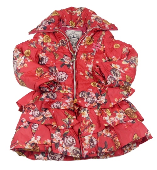 Malinový prešívaný šušťákový zimný kabát s růžemi a volánikmi Le Chic