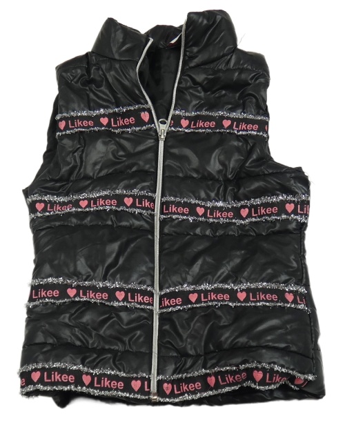 Čierna šušťáková zateplená trblietavá vesta s nápismi