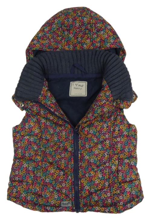 • Tmavomodrá šušťáková prešívaná zateplená vesta s kvietkami a kapucí znl. Next