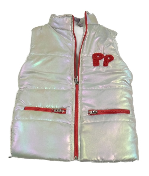 Bielo-červená šušťáková trblietavá zateplená vesta s písmeny