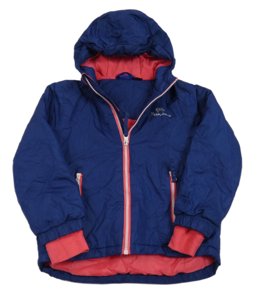 • Tmavomodrá šušťáková funkčná zimná lyžiarska bunda s nápismi a kapucňou lupilu