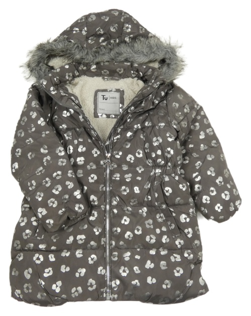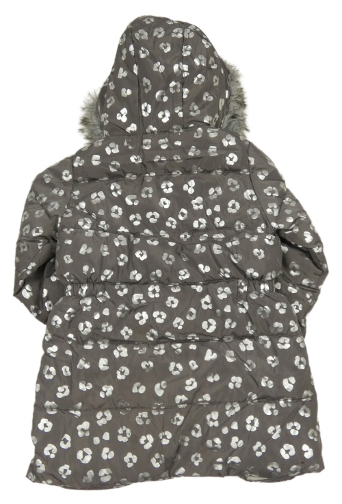 • Tmavošedo-strieborný vzorovaný prešívaný šušťákový zimný kabát s kapucňou s kožešinou Tu