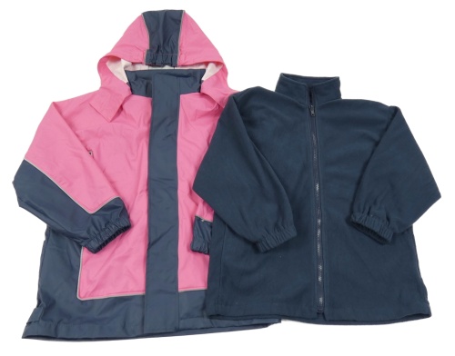 2 set - ružovo-tmavomodrá nepromokavá bunda s kapucí + tmavomodrá prepínaci fleecová mikina
