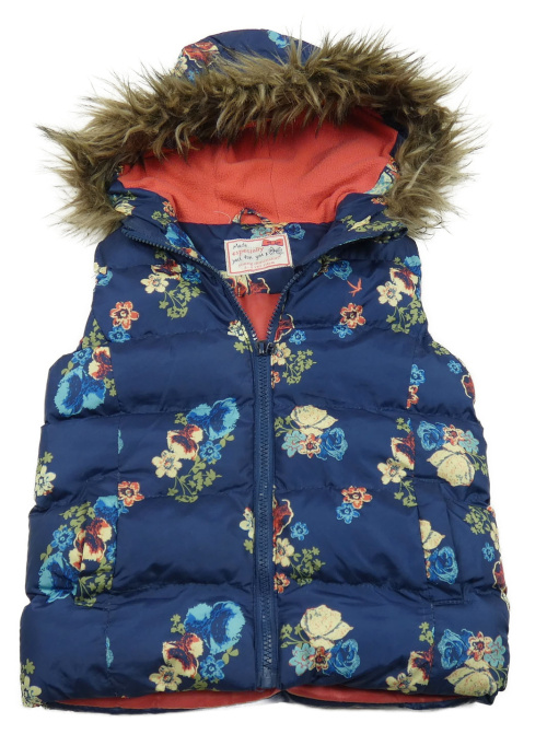 Tmavomodrá šušťáková zateplená vesta s kvietkami a kapucňou Yd.
