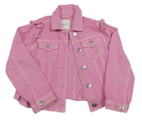 Ružová rifľová crop bunda s volánikmi a golierikom Next