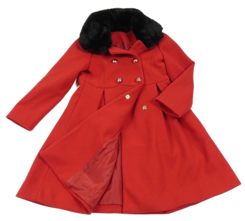 • Červený flaušový podšitý kabát s gombíky a čierným kožušinovým golierikom St. Bernard