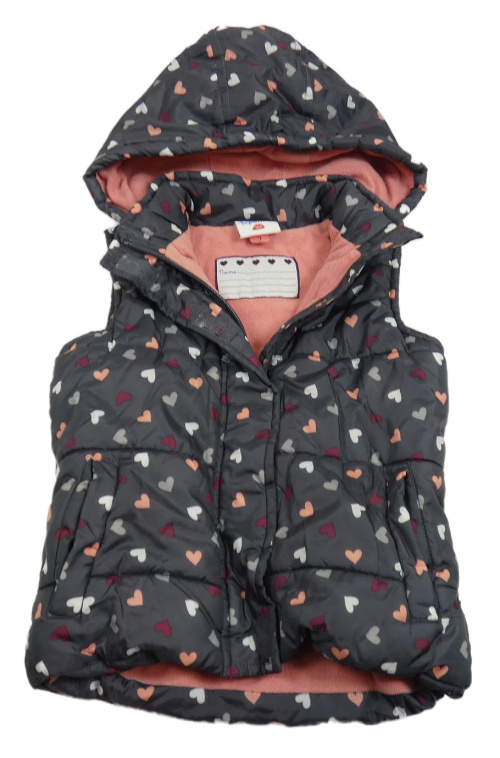 Tmavosivá šušťáková zateplená vesta so srdiečkami a kapucňou Topolino