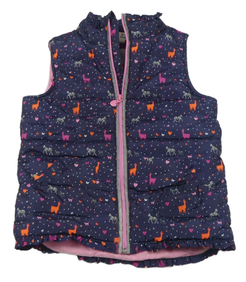 • Tmavomodrá bodkovaná á prešívaná šušťáková zateplená vesta so zvieratkami a srdiečkami Topolino