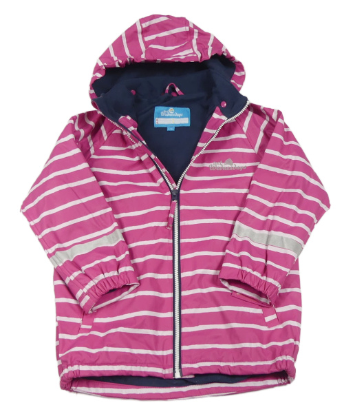• Tmavorůžovo-biela pruhovaná nepromokavá jarná bunda s nápisom a odopínacíá kapucňou