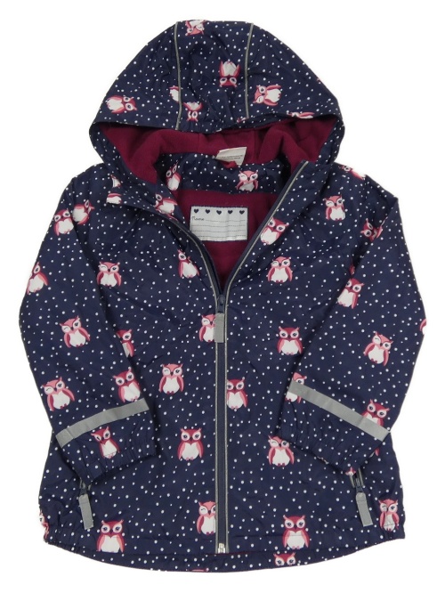 • Tmavomodrá bodkovaná á šušťáková jarná bunda so sovičkami a kapucňou Topolino