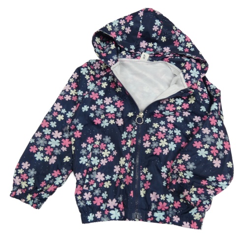 Tmavomodro-ružová kvetovaná šušťáková jarná bunda s kapucňou