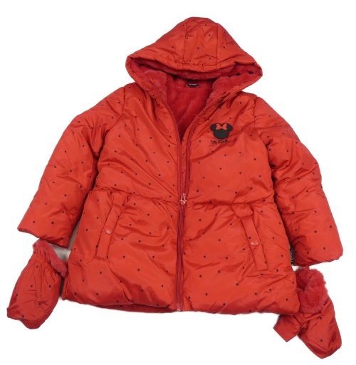 Červená šušťáková zimná bunda s Minnií a kapucí + rukavice George