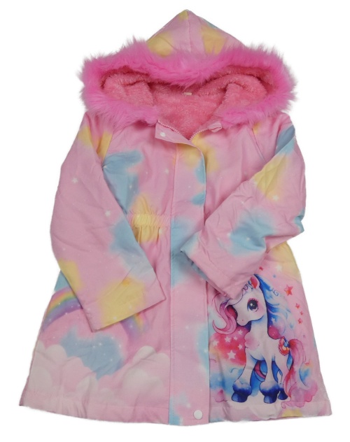 Ružovo-modro-žltá batikovaná zateplená parka s jednorožcom a kapucňou