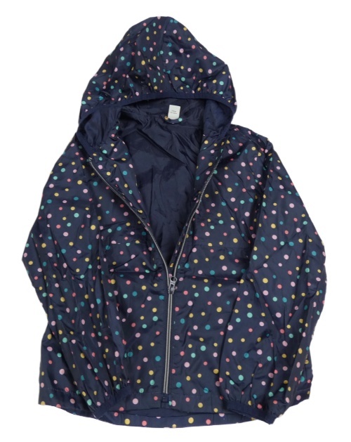 Tmavomodrá šušťáková jesenná bunda s farebnymi bodky a kapucňou Tu