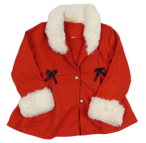 Červený flaušový kabát s mašľami a bílou kožešinou a golierikom