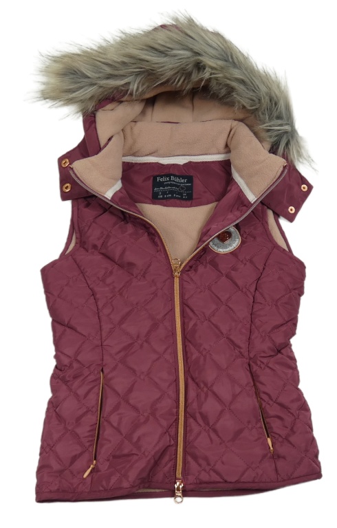 • Vínová šušťáková prešívaná zateplená vesta s nášivkou a kapucňou s kožešinou