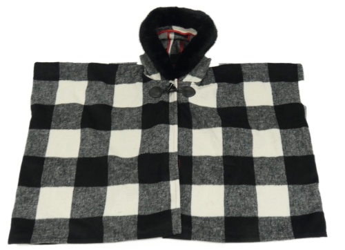 Čierno-biele kockované vlnené pončo s kapucňou s kožešinou St. Bernard