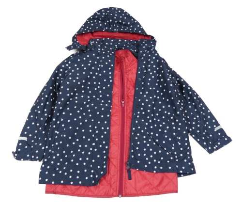 3v1 - Tmavomodrá bodkovaná á šušťáková jarná bunda s odopínacíá kapucí + malinová prešívaná šušťáková zateplená vesta TCM