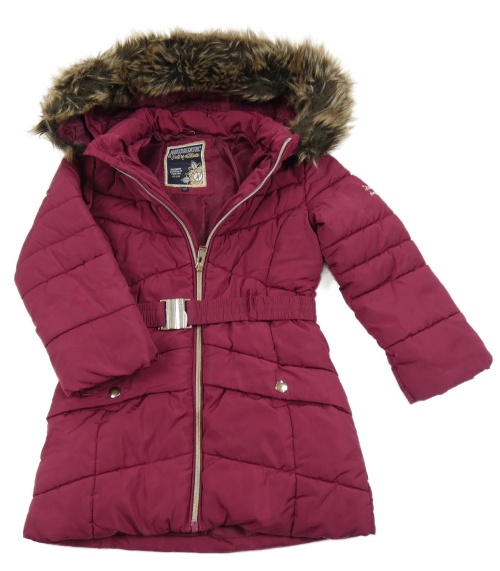 Vínová šušťáková zimná bunda s opaskom a kapucňou s kožešinou C&A