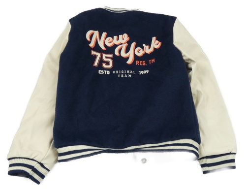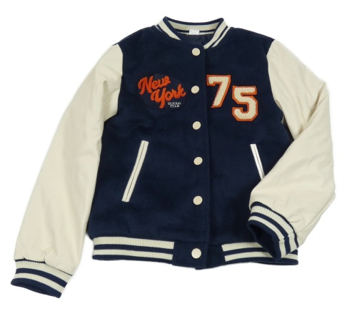 • Tmavomodro-smetanový flaušovo/koženkový baseballový zateplený bomber s číslom a nápismi ZEEMAN