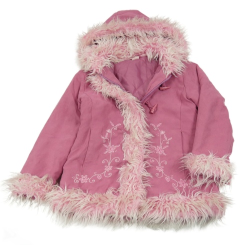 Ružový semišový zateplený kabát s kvietkami a srdiečkami a kožešinou a odopínacíá kapucňou myc