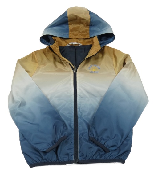• Medovo-bielo-modro-tmavomodrá ombré šušťáková jarná bunda s nápismi a slniečkom a odopínacíá kapucňou H&M
