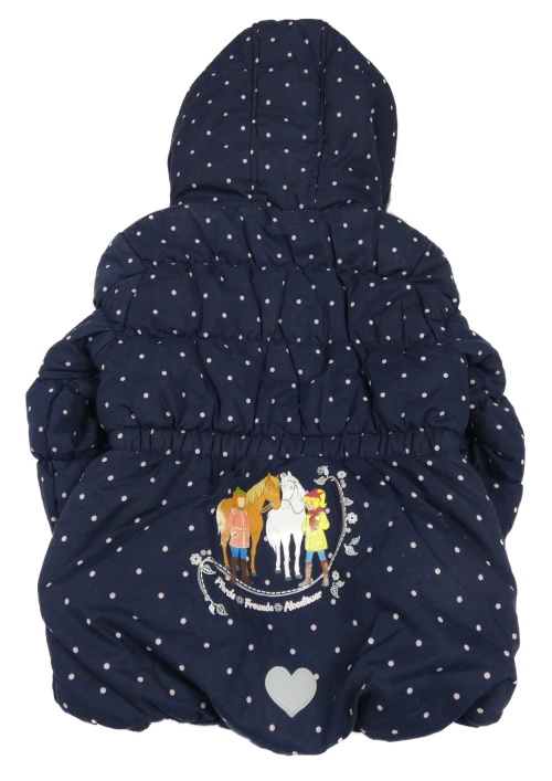 • Tmavomodro-ružová bodkovaná á šušťáková zimná bunda s koníky a kapucňou s kožešinou
