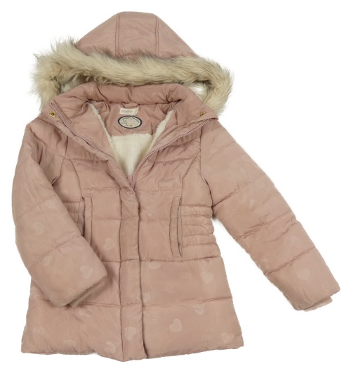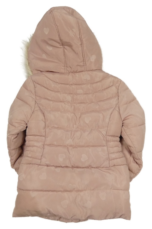 • Svetloružový prešívaný šušťákový zimný kabát so srdiečkami a nápismi a kapucňou s kožešinou ORCHESTRA