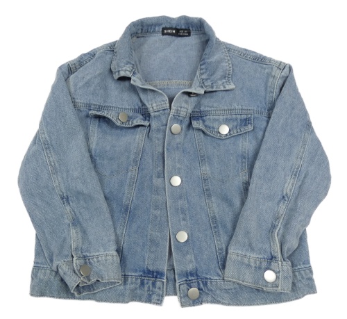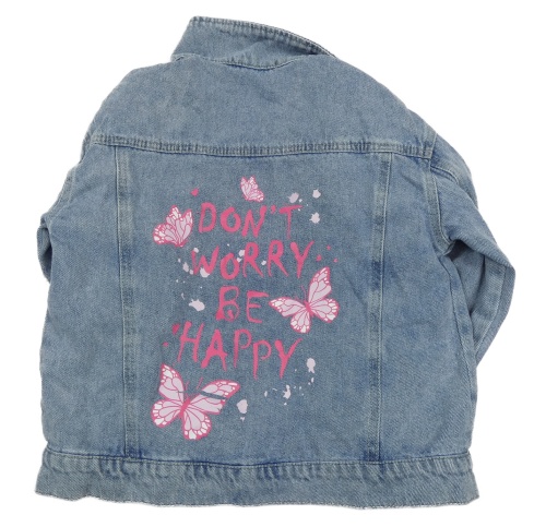 Modrá rifľová bunda s motýlikmi a nápismi a golierikom SHEIN