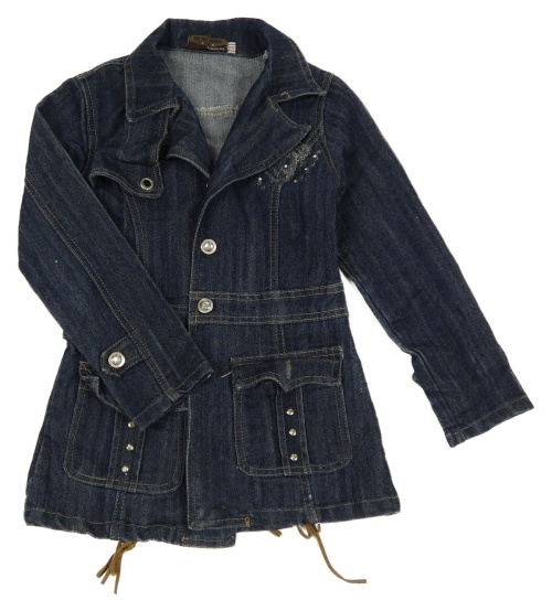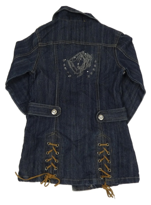 Tmavomodrý rifľový kabát s kamienkami a šnurovaním a golierikom