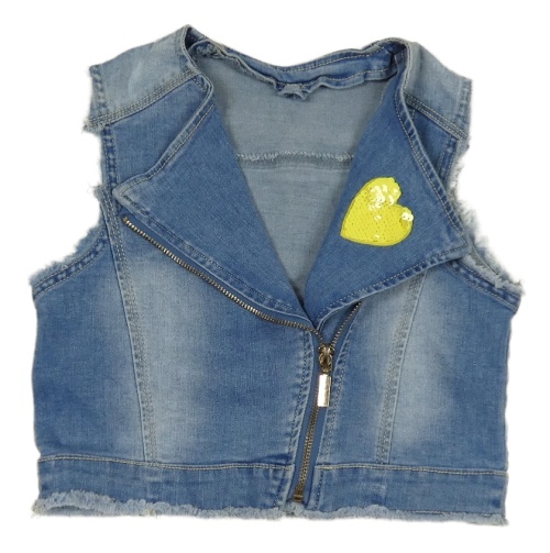 Modrá rifľová crop vesta so srdcem z překlápěcích flitrů