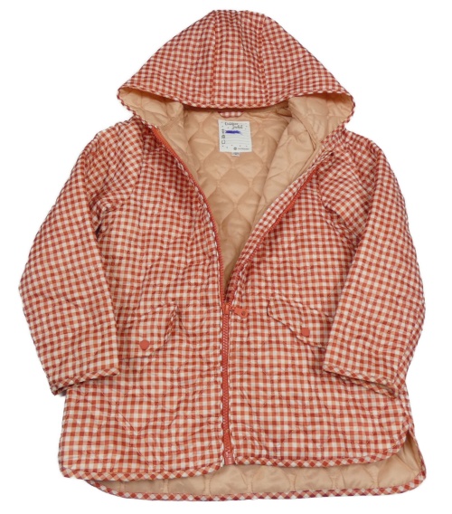 • Červeno-biela kockovaná prešívaná šušťáková zateplená bunda s kapucňou Vertbaudet