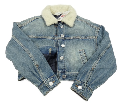 Nové - Modrá crop rifľová zateplená bunda s huňatým golierikom H&M