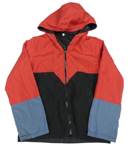 Červeno-čierno-modrá šušťáková jarná bunda s kapucňou