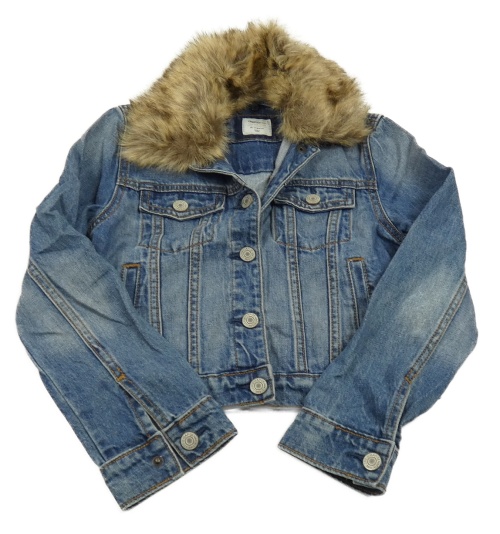 Modrá rifľová crop bunda s kožušinovým golierom GAP