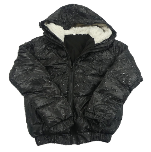 Čierna šušťáková prešívaná zimná bunda so vzorom a kapucňou