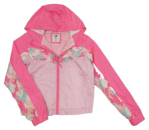 Neonovo-svetloružová šušťáková jesenná crop bunda s army vzorom a kapucňou