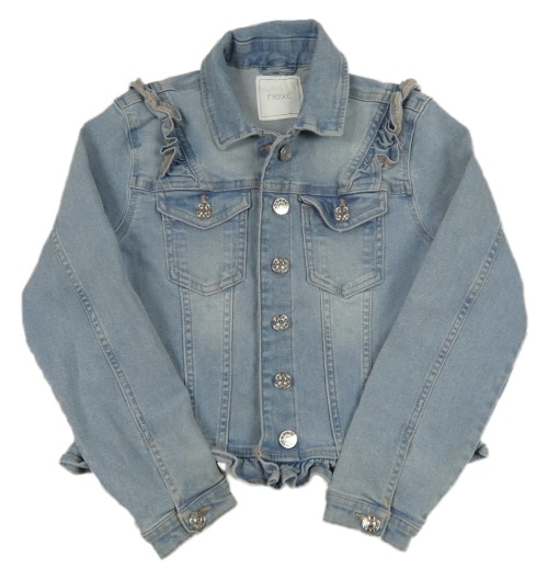 Svetlomodrá rifľová crop bunda s volánikmi Next