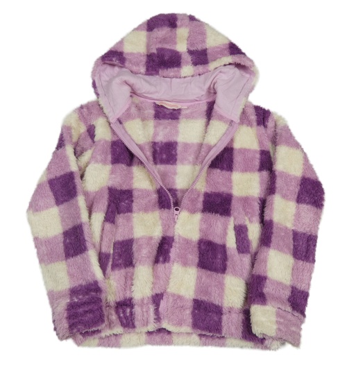 Fialovo-biela kockovaná chlpatá bunda s kapucňou