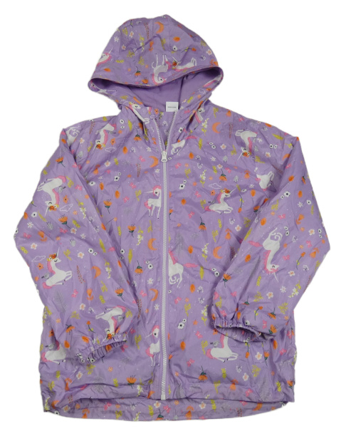 Fialová šušťáková jarná bunda s jednorožcami a kapucňou