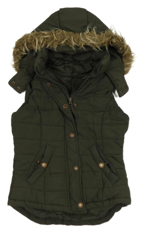 Khaki šušťáková zateplená vesta s kapucňou a kožúškom