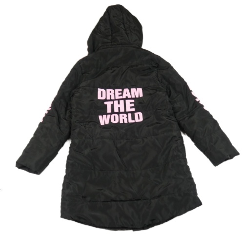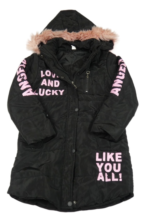 Čierno-ružová šušťáková zimná bunda s nápisy a kapucňou s kožešinou