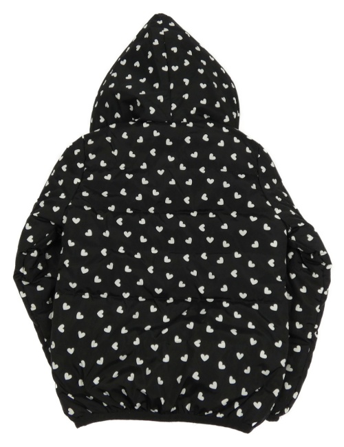 Čierna šušťáková prešívaná zimná bunda so srdiečkami a kapucňou