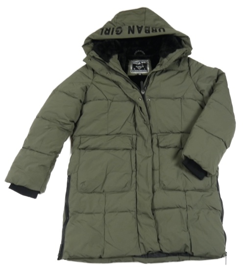 • Tmavokhaki prešívaný šušťákový zimný kabát s nášivkou a kapucňou URBAN GIRL