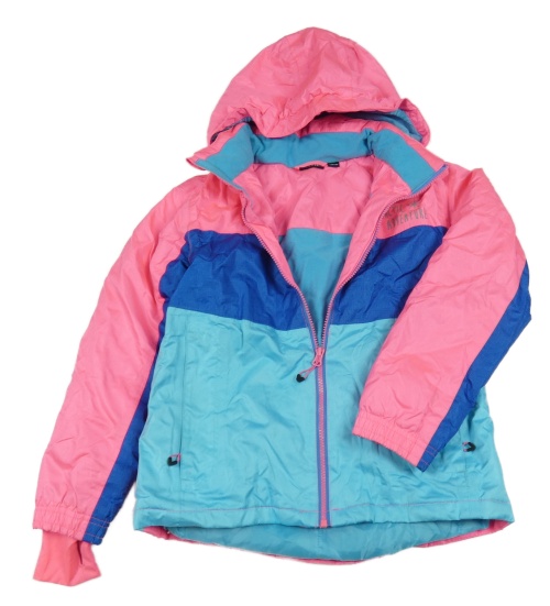 • Azurovo-safírovo-neónově ružová šušťáková funkčná zimná lyžiarska bunda s nápismi a odopínacíá kapucňou crivit
