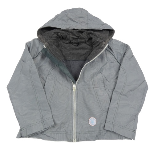 Sivá šušťáková jarná bunda s nášivkou a kapucňou
