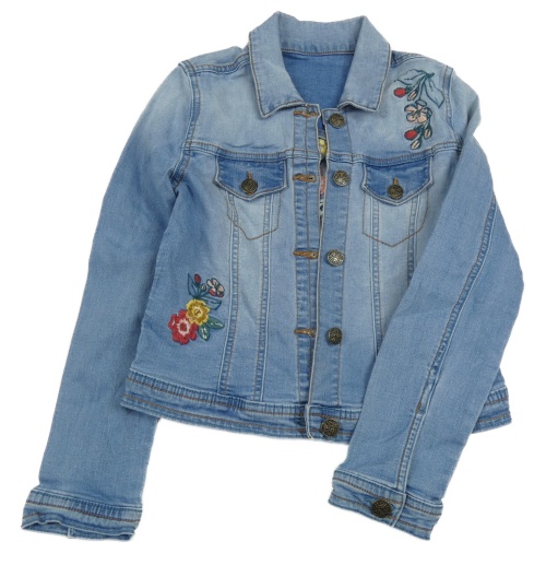 • Svetlomodrá tepláková rifľová crop bunda s kvietkami a vtáčikom a golierikom NUTMEG