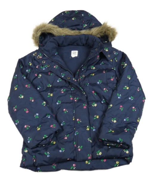 Tmavomodrá kvetovaná šušťáková zateplená bunda s kapucňou s kožešinou GAP