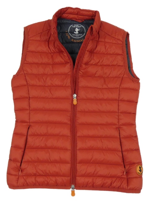 Hrdzavá prešívaná šušťáková zateplená vesta s nášivkou