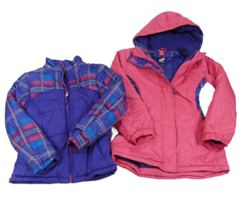 2x šusťáková zimní bunda - fialová s kostkovanými rukávy + ružová s kapucňou